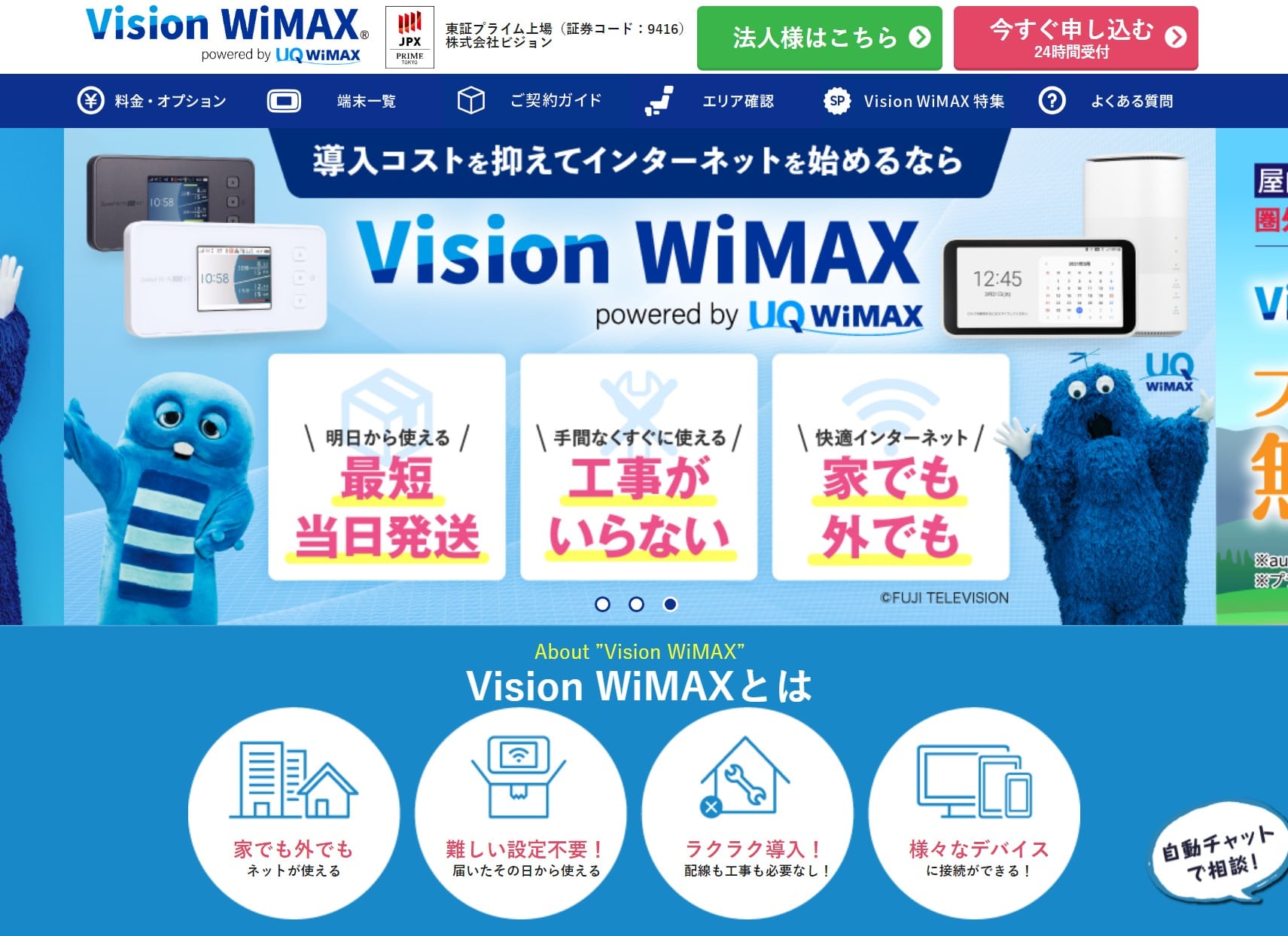 Vision WiMAX は東西2か所に発送拠点を設けています。他社であれば発送拠点は1か所にしているところが多いですが、東西に2か所あることで端末の到着が速いのが特徴です。